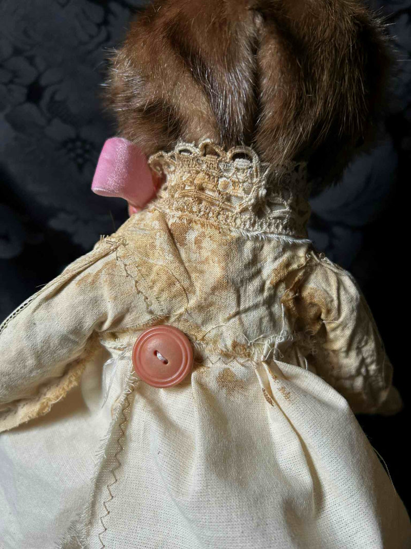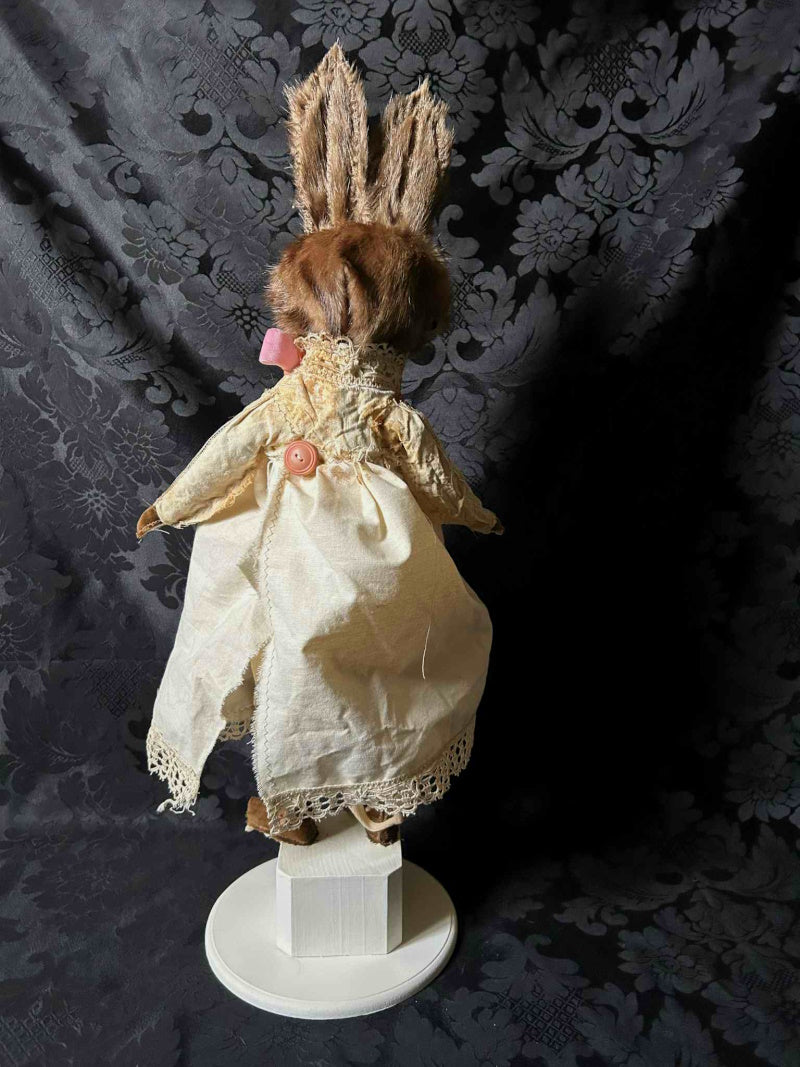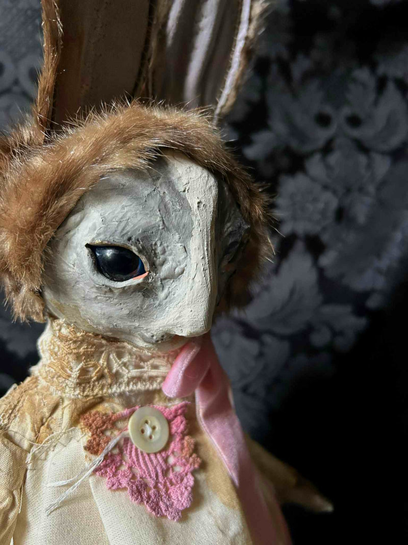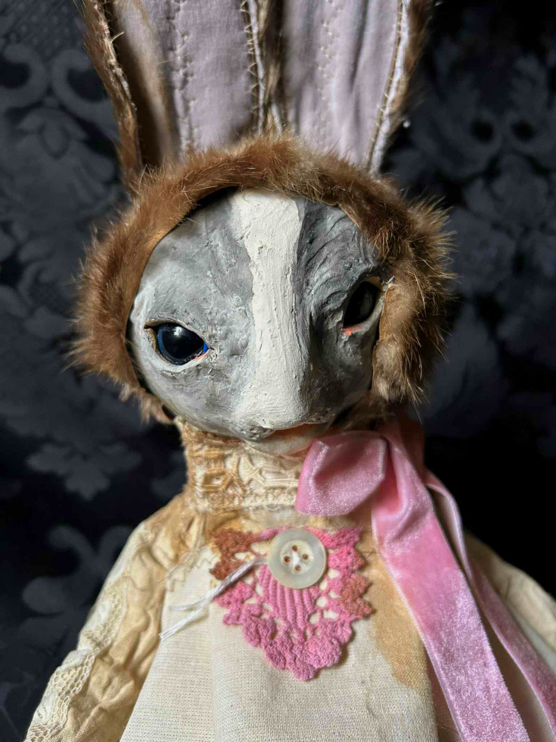NATARI is a brown rabbit in pink velvet ribbon, stained calico and antique fur.