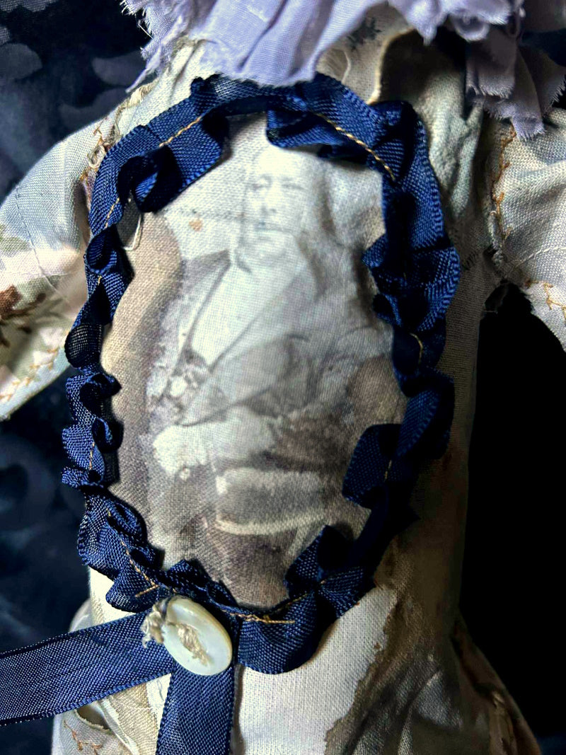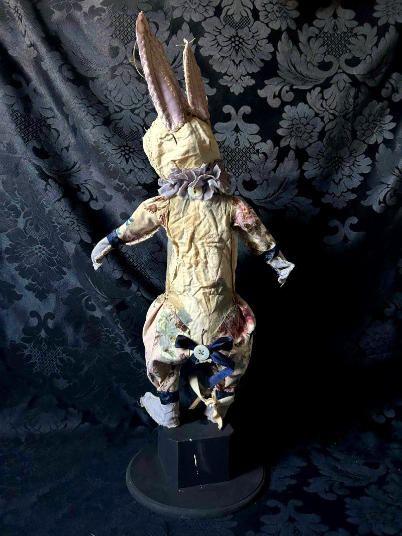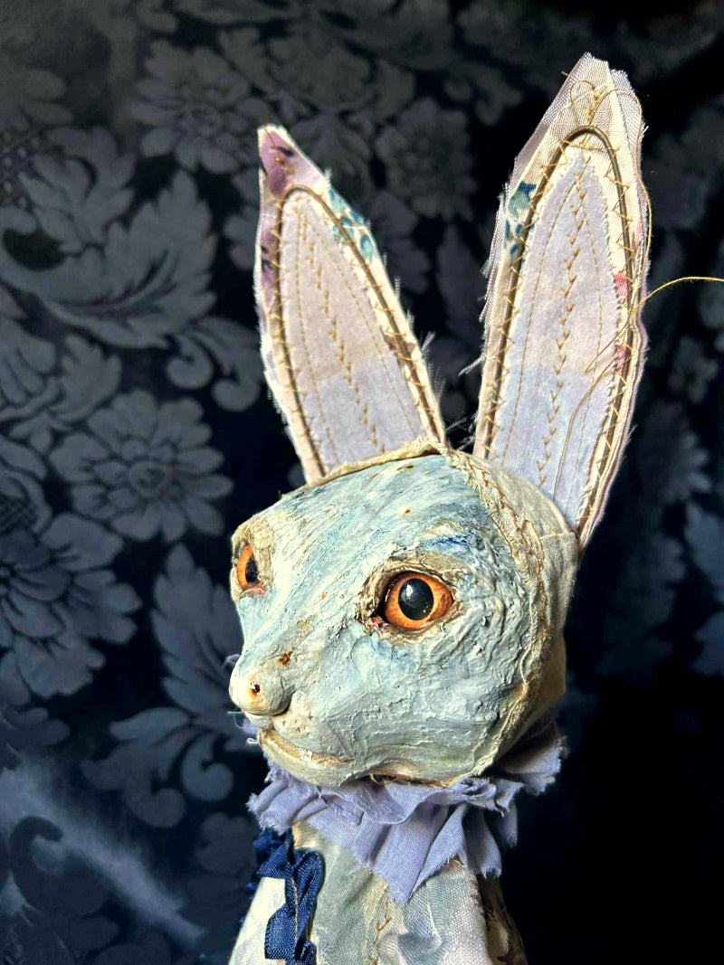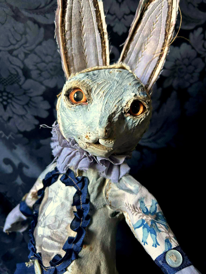 TWAMLEY is a mysterious golden eyed rabbit, in antique fur and vintage cotton.