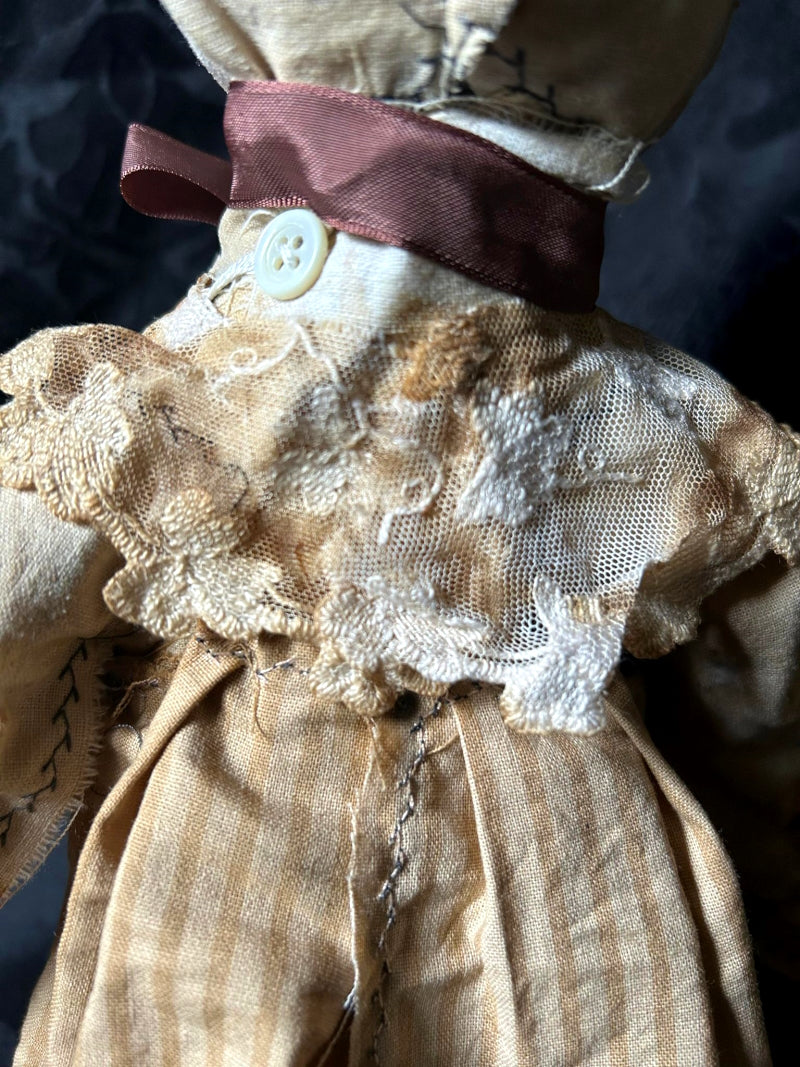 IMBAH is a little brown rabbit in antique lace, cotton stripes and antique fur.
