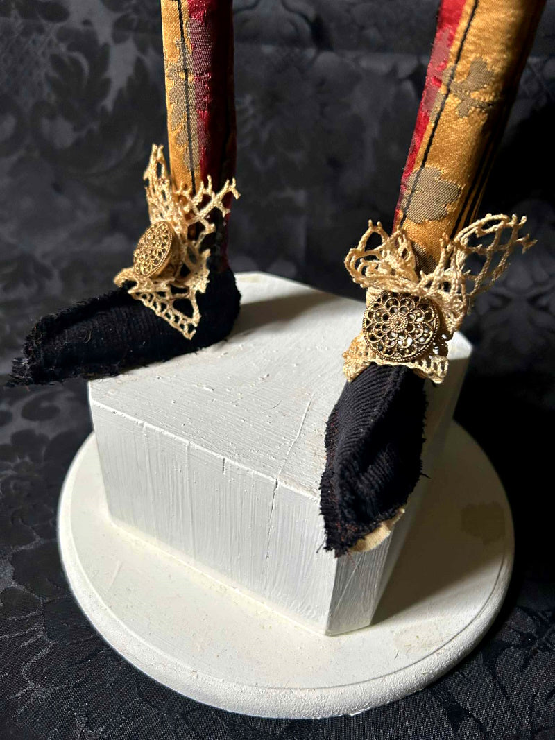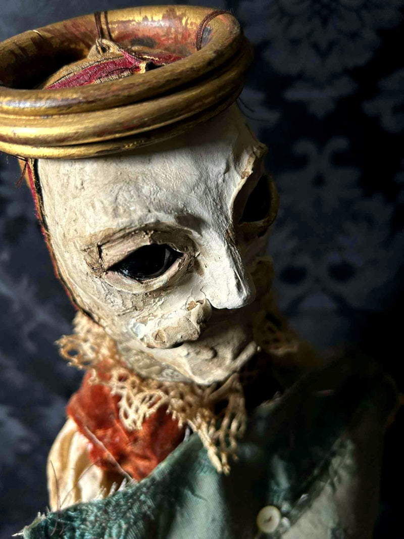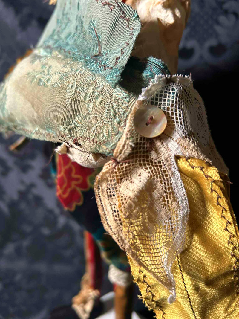Wearing French lace and haberdashery sourced directly from the brocante markets of Paris and rural France. FISH has French 1800's green brocade and antique mother of pearl buttons.