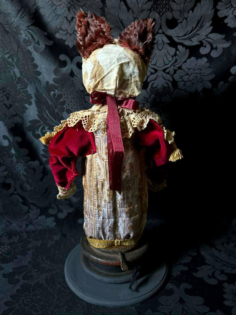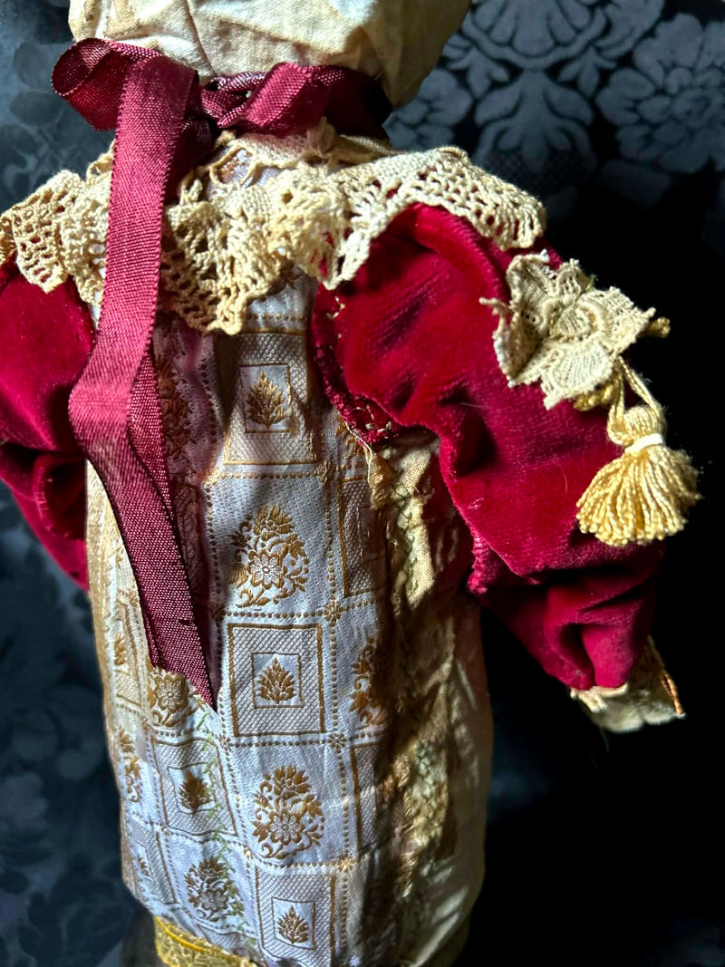 In vintage silk, crimson upholstery velvet and antique fur.