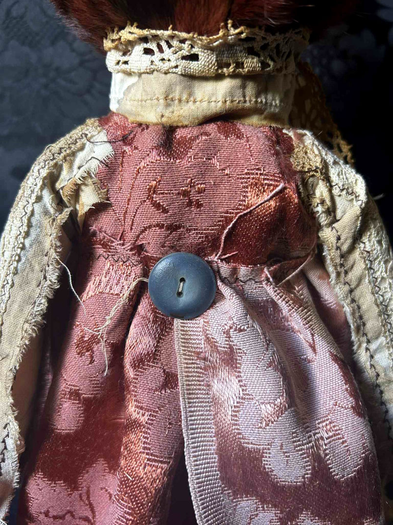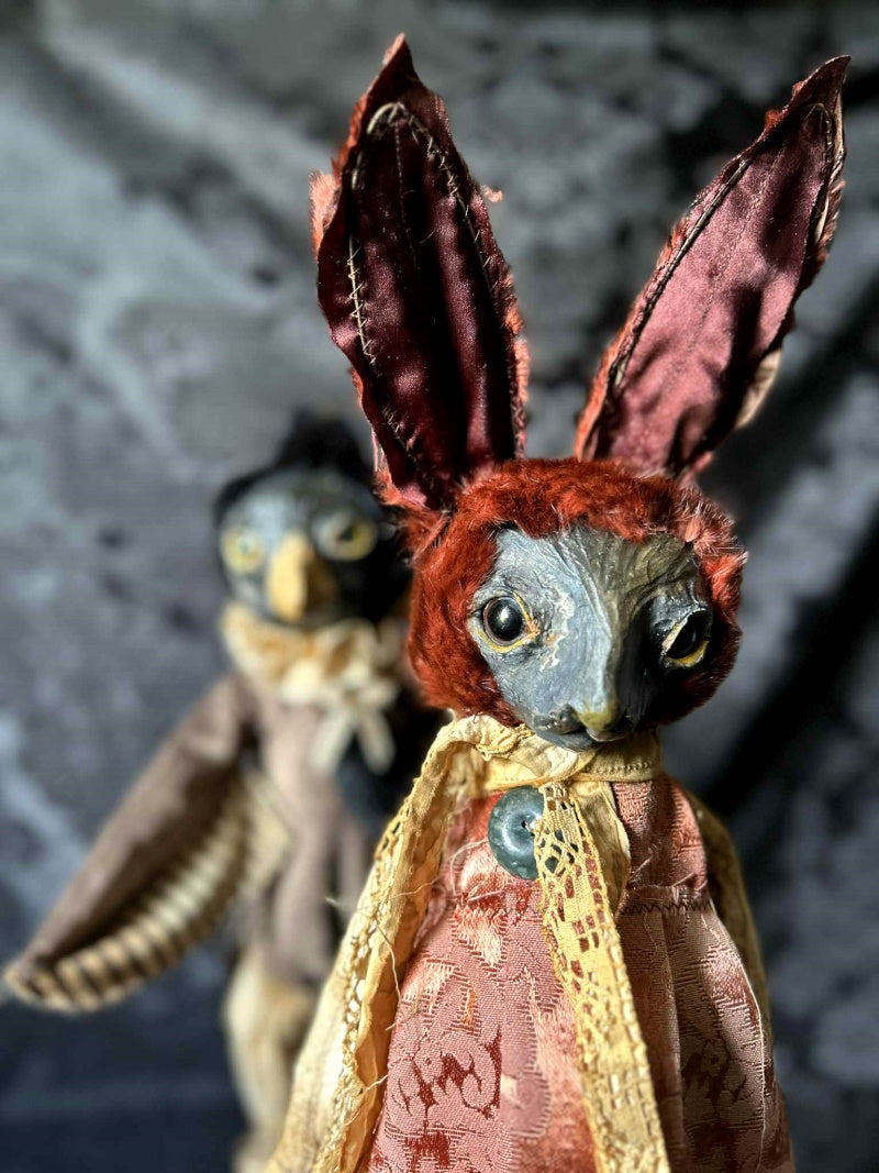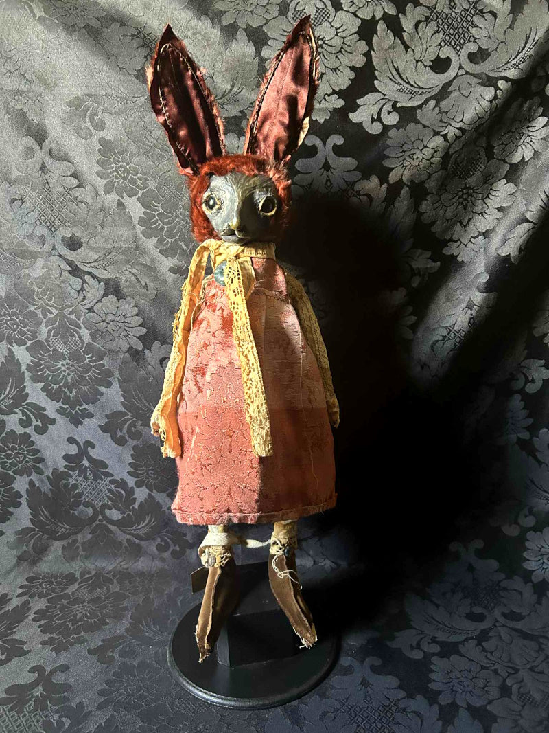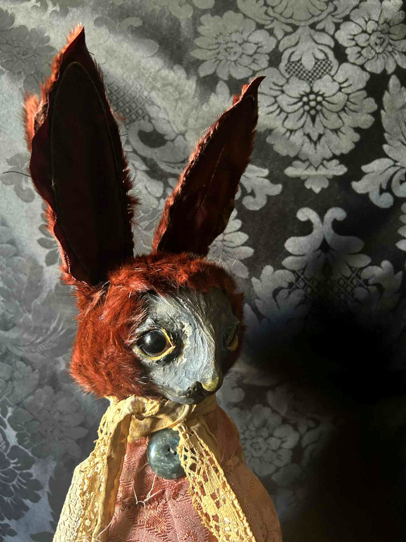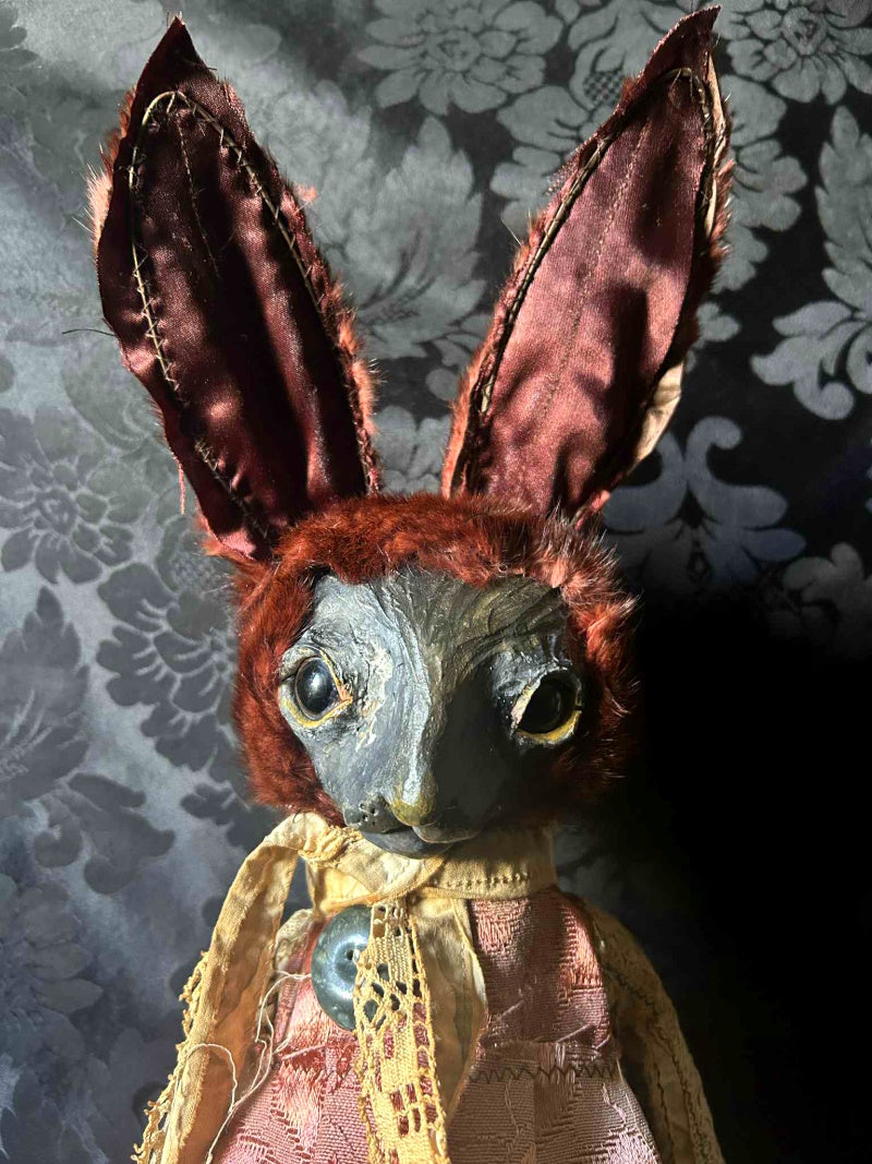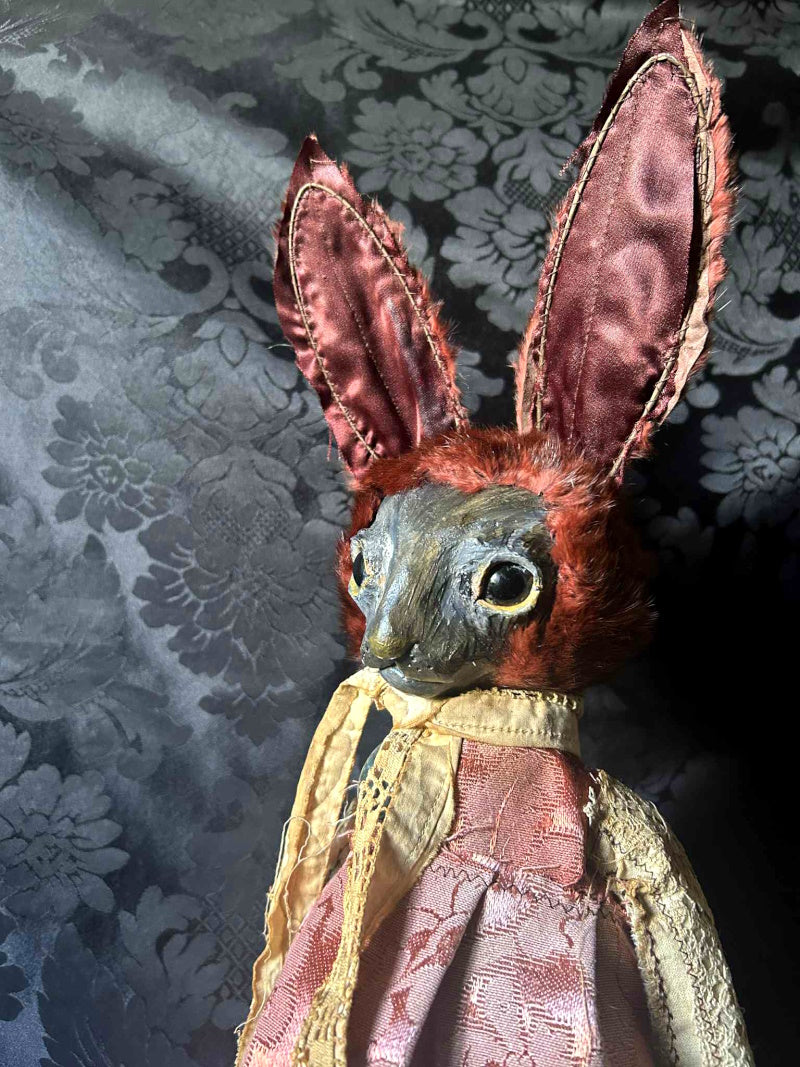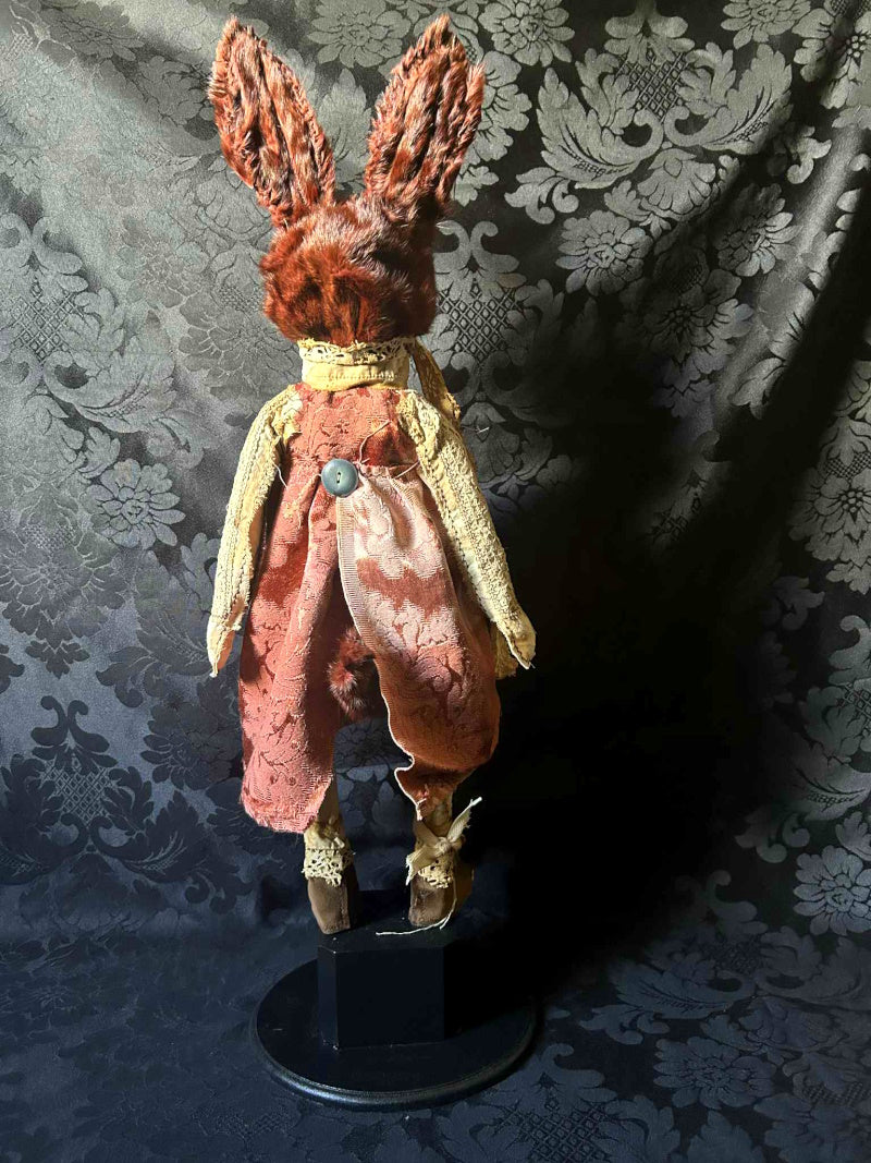 SALVATRICE is a shy marron rabbit in antique upholstery brocade and antique fur.