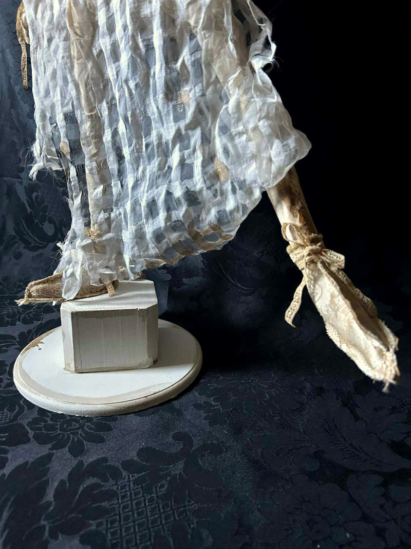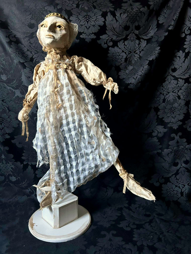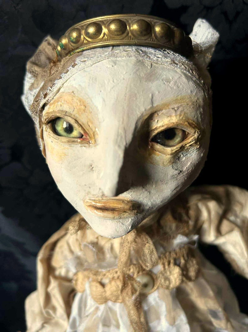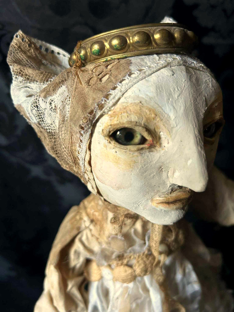 TIORBA is an angelic, dreamy eyed dancer. In stained calico and vintage threadbare cotton, with antique French ormolu crown.