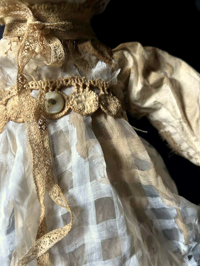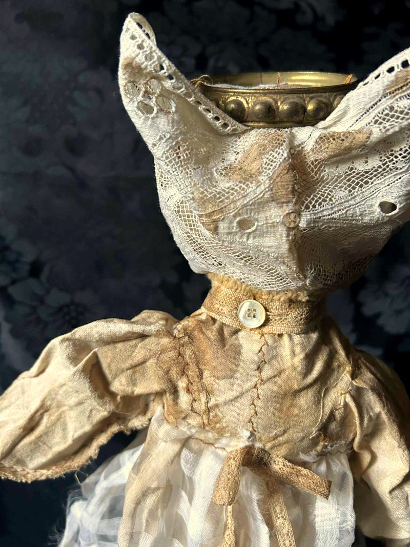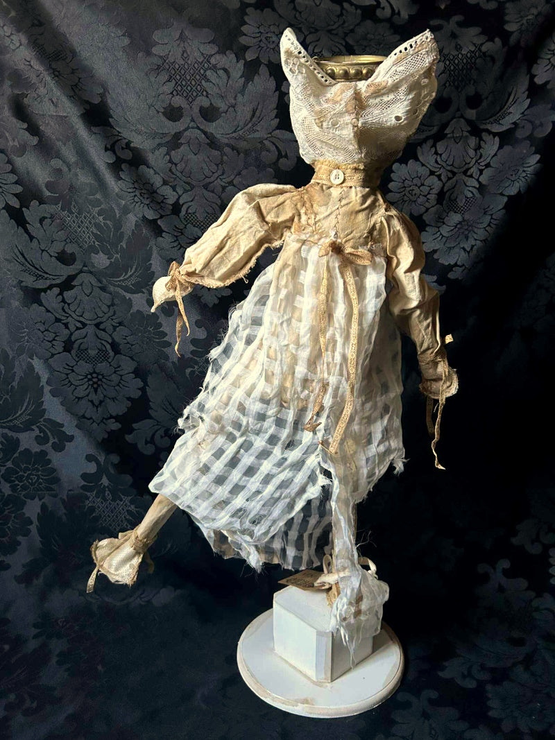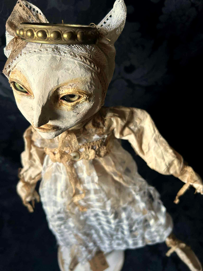 TIORBA is an angelic, dreamy eyed dancer. In stained calico and vintage threadbare cotton, with antique French ormolu crown.