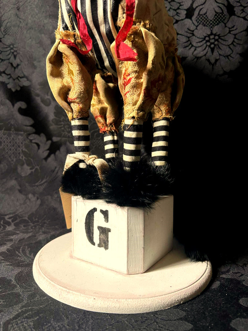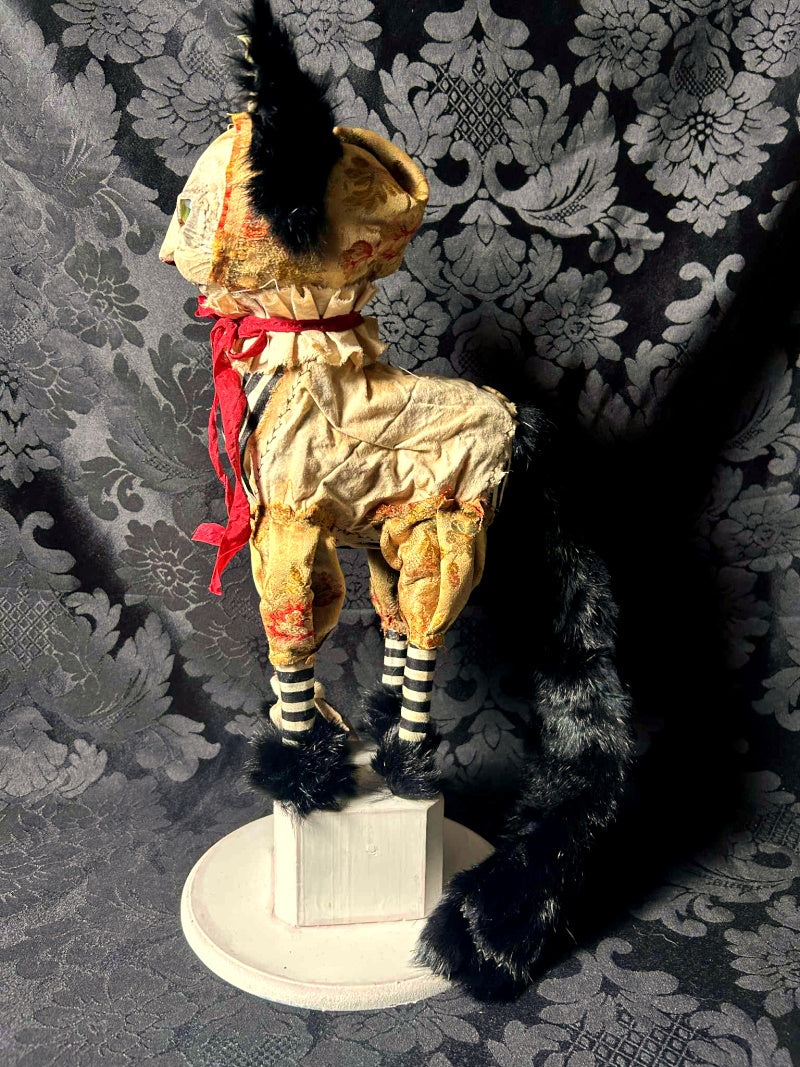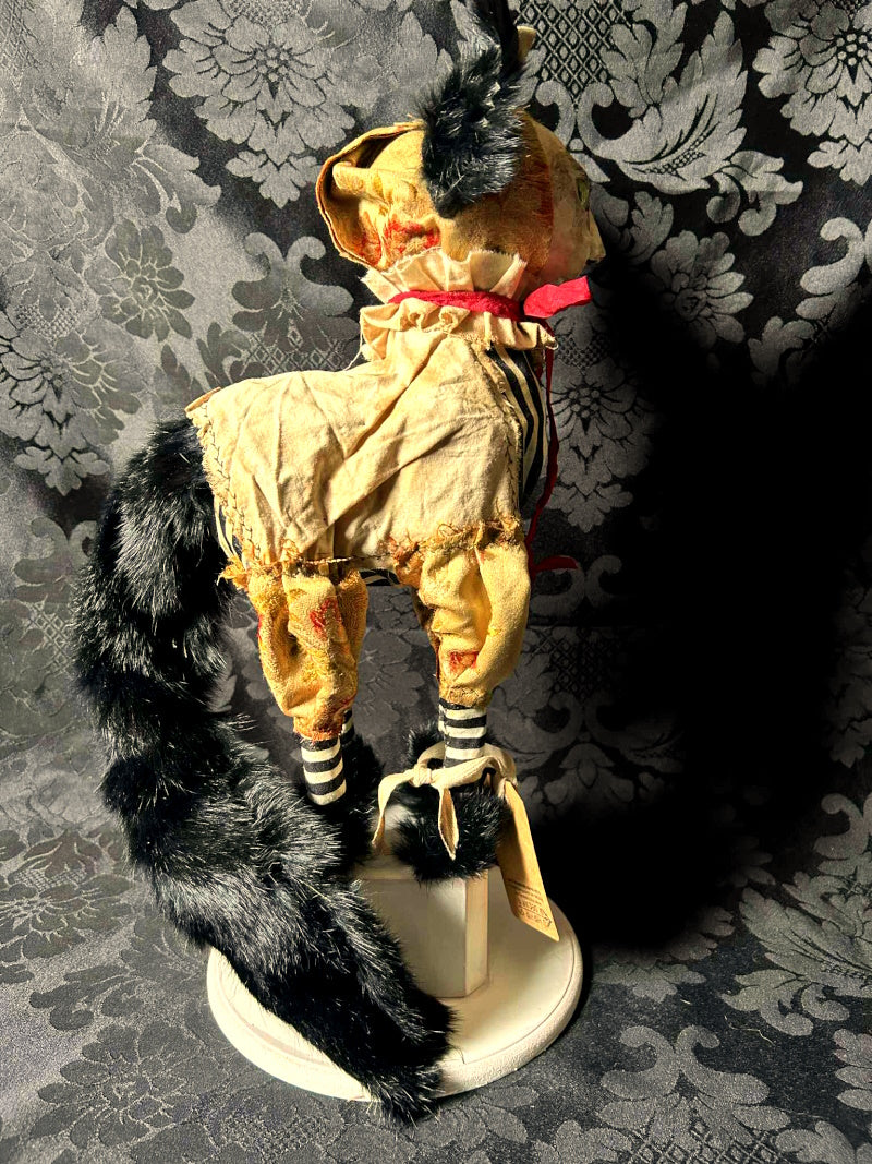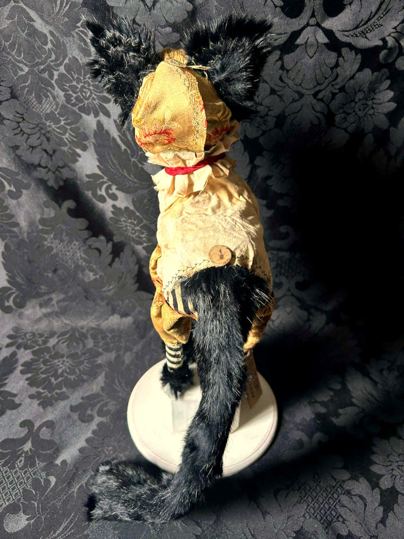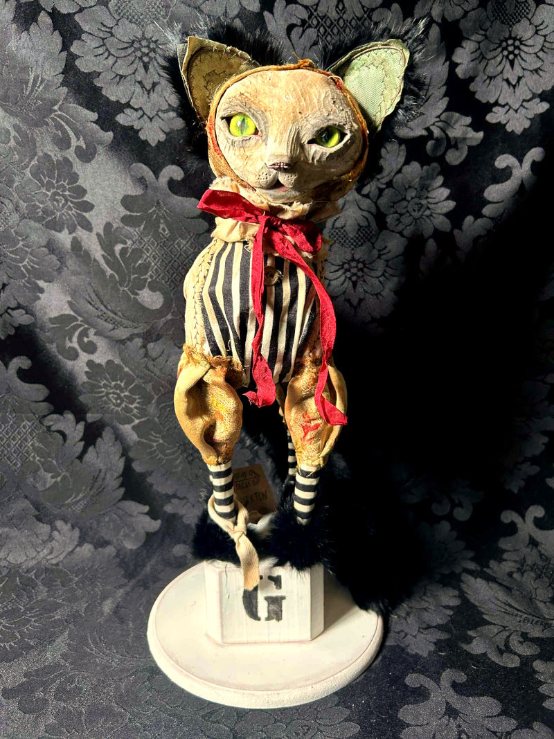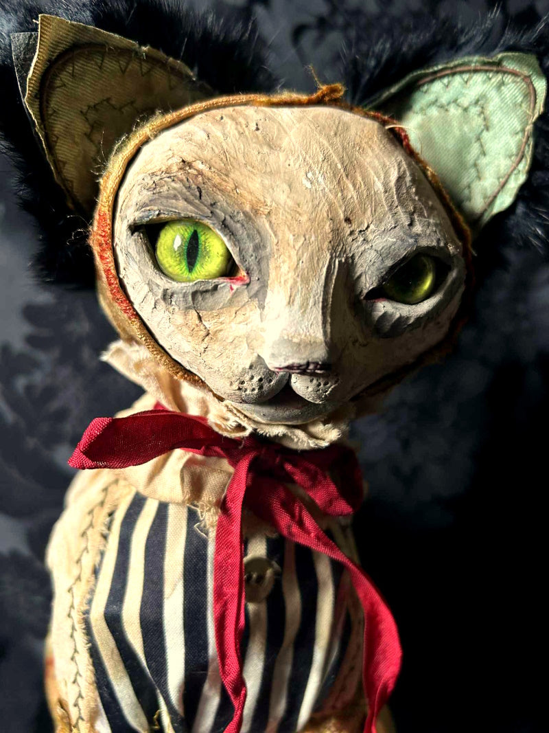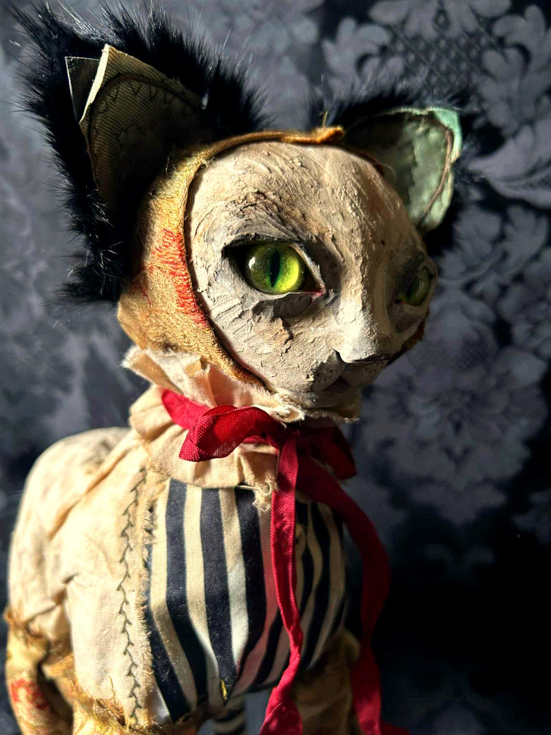 YORKTON is a green eyed cat in 1800's French brocade, antique fur and cream & black stripes.