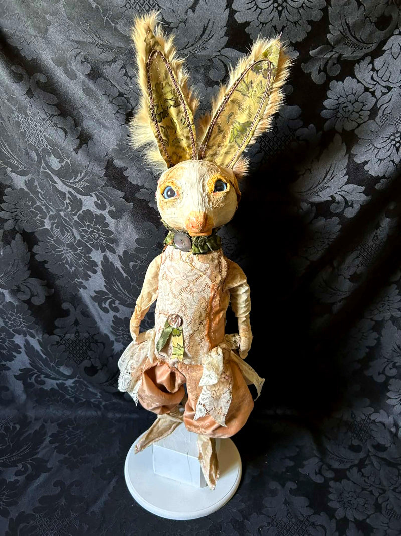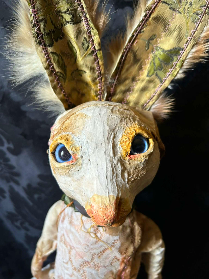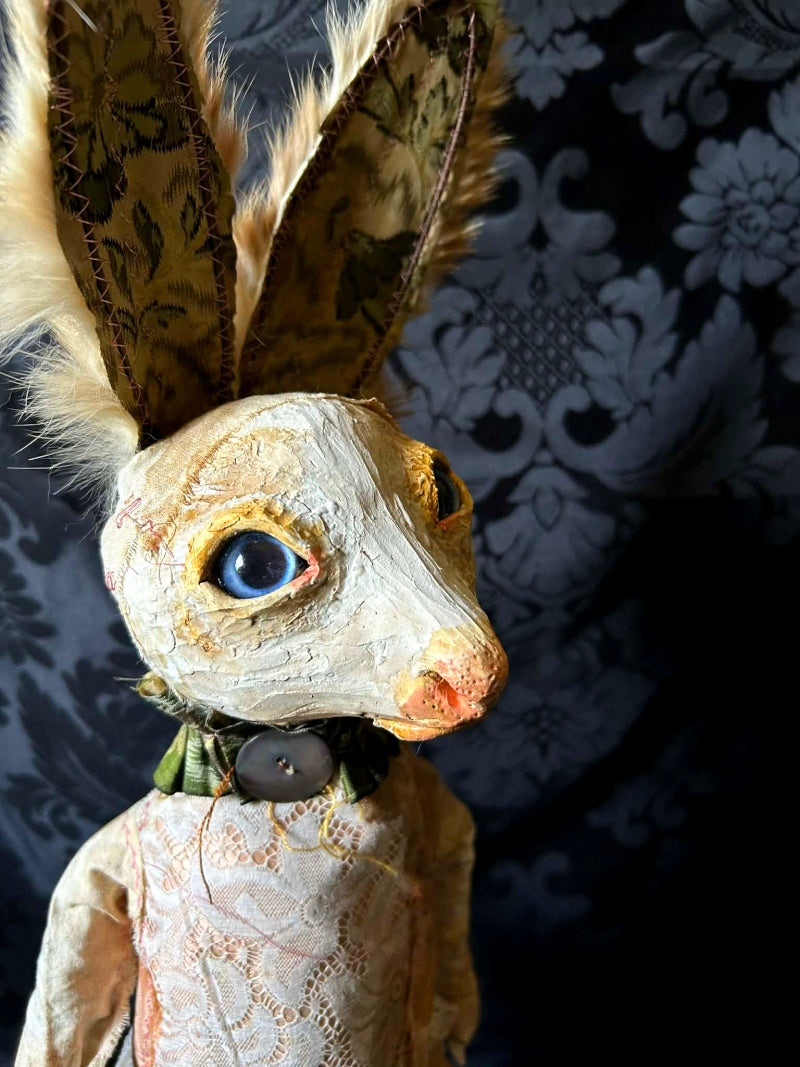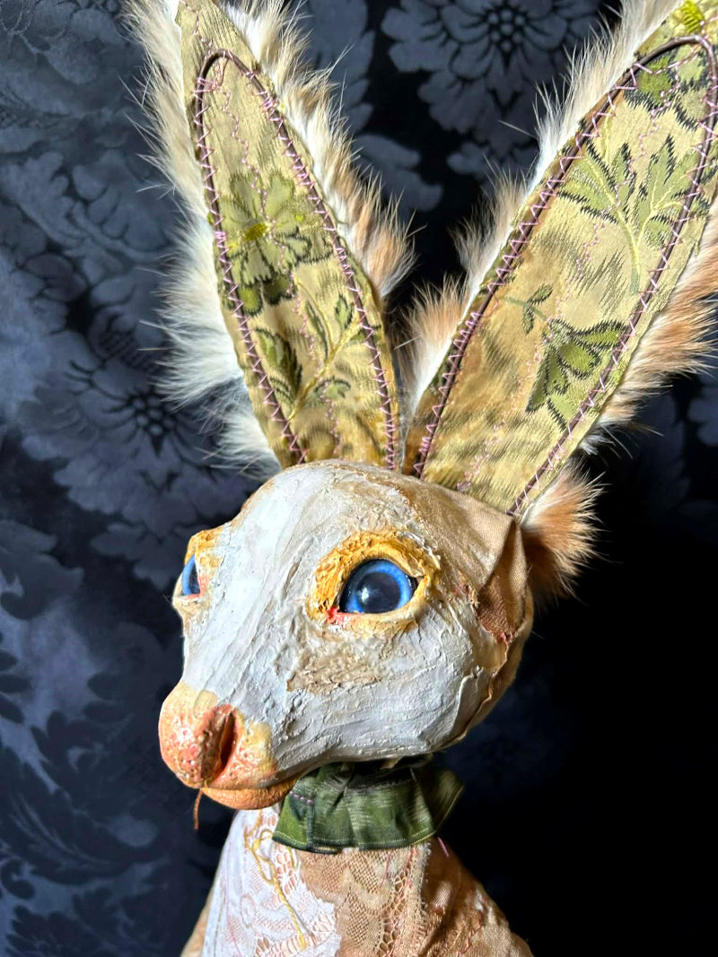 UVALDE is a blue eyed rabbit in antique brocade and antique fur.